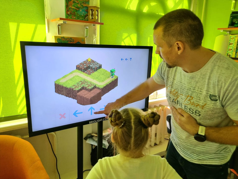 Інтерактивна панель Briolight – це сучасний та ефективний інструмент для розвитку й корекції, спеціально розроблений для роботи з дітьми в інклюзивних центрах, дитячих реабілітаційних закладах, школах, дитячих садочках, а також у кабінетах дитячих психологів та логопедів. Панель створена для того, щоб зробити корекційні та навчальні заняття з дітьми максимально цікавими, продуктивними та комфортними. Інтерактивний LCD-екран встановлено на мобільну підлогову стійку з колесами, яку легко переміщувати в дитячих приміщеннях.
